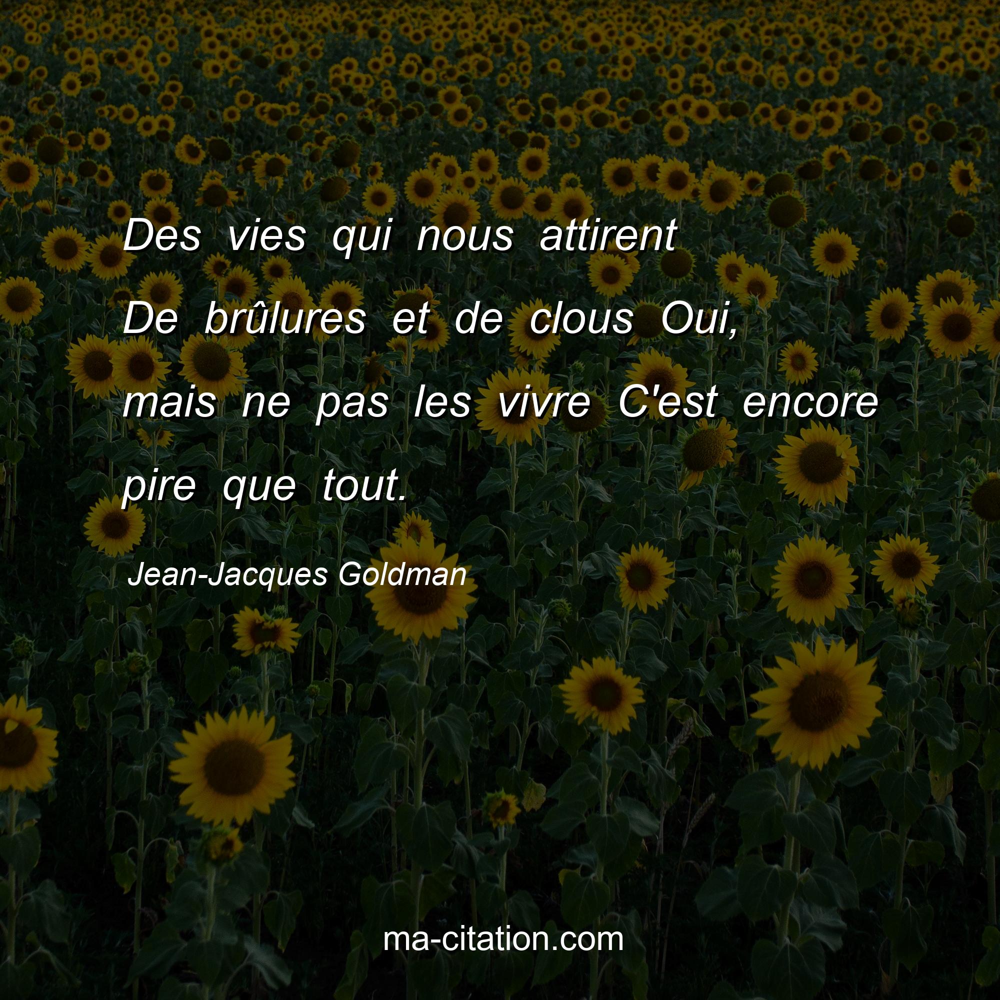 Citation sur la vie de Jean-Jacques Goldman :Des vies qui nous attirent De brûlures et de clous Oui, mais ne pas les vivre C'est encore pire que tout.