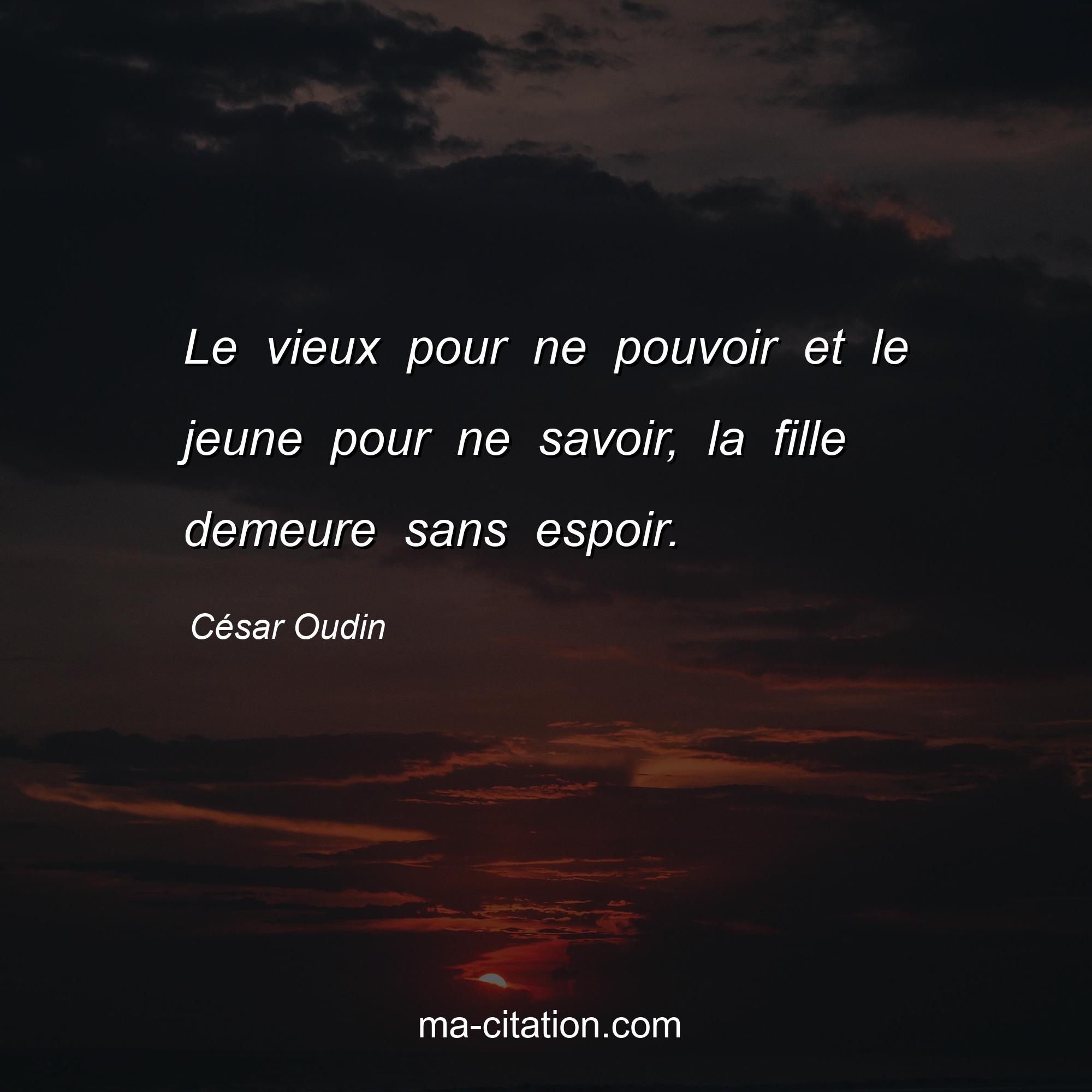 Citation sur la vie de César Oudin :Le vieux pour ne pouvoir et le jeune pour ne savoir, la fille demeure sans espoir.