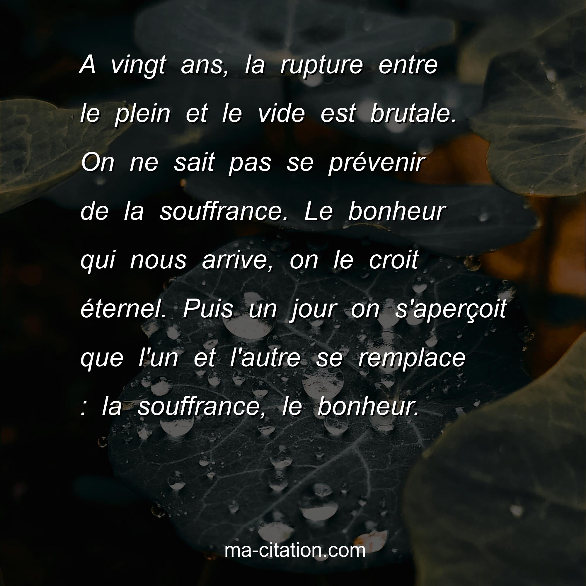 A vingt ans, la rupture entre le plein et le vide est brutale. On ne sait pas se prévenir de la souffrance. Le bonheur qui nous arrive, on le croit éternel. Puis un jour on s'aperçoit que l'un et l'autre se remplace : la souffrance, le bonheur.