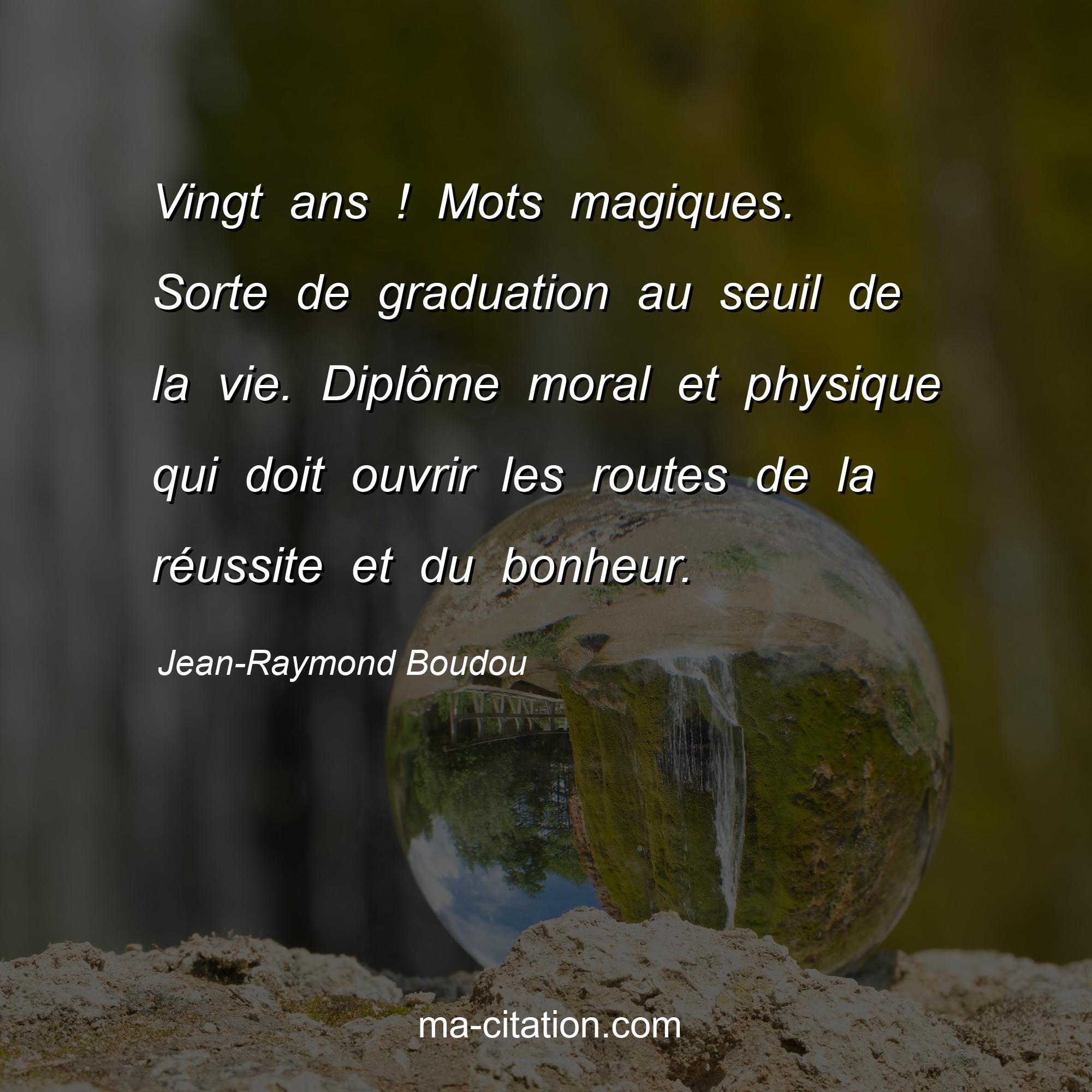 Jean-Raymond Boudou est l'auteur de la citation sur la vie "Vingt ans ! Mots magiques. Sorte de graduation au seuil de la vie. Diplôme moral et physique qui doit ouvrir les routes de la réussite et du bonheur.".