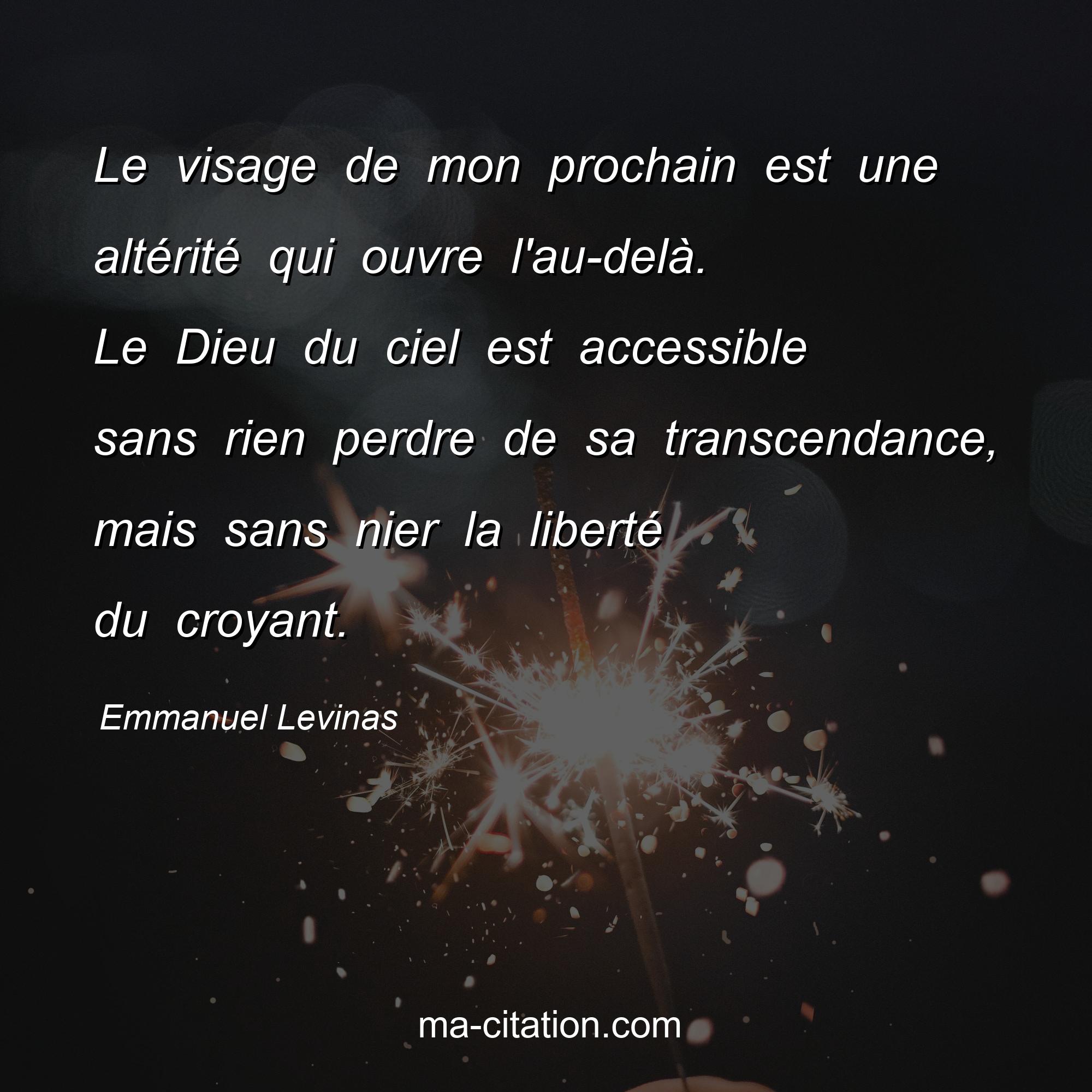 Citation sur la vie d'Emmanuel Levinas :Le visage de mon prochain est une altérité qui ouvre l'au-delà . Le Dieu du ciel est accessible sans rien perdre de sa transcendance, mais sans nier la liberté du croyant.