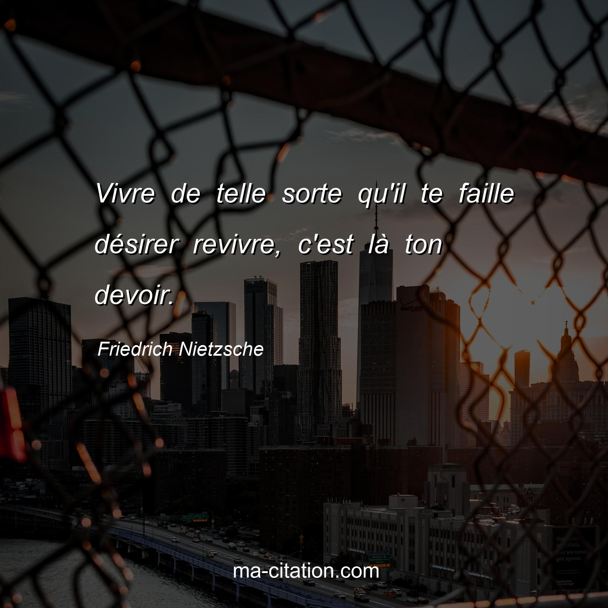Citation sur la vie de Friedrich Nietzsche :Vivre de telle sorte qu'il te faille désirer revivre, c'est là ton devoir.