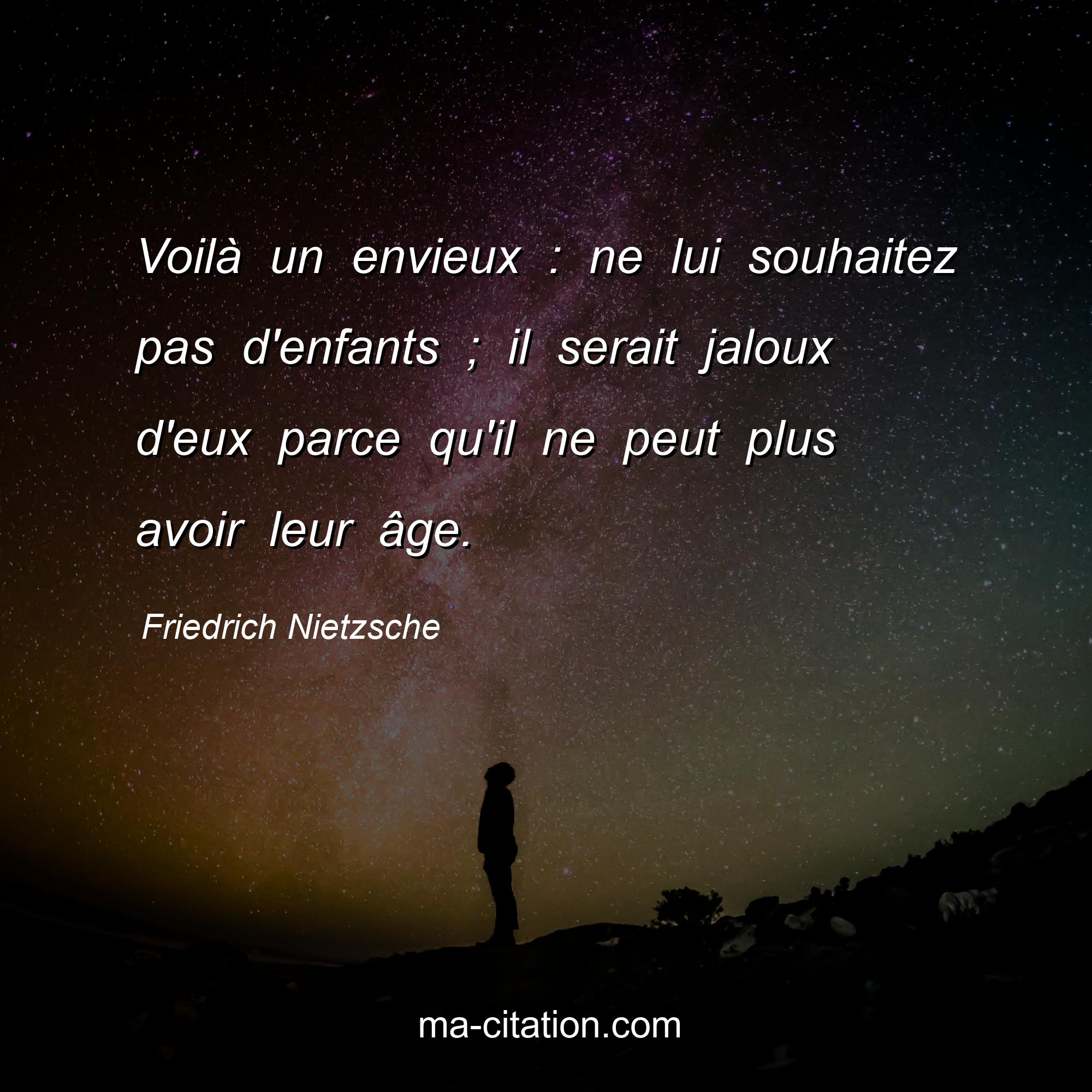 Citation sur la vie de Friedrich Nietzsche :Voilà un envieux : ne lui souhaitez pas d'enfants ; il serait jaloux d'eux parce qu'il ne peut plus avoir leur âge.