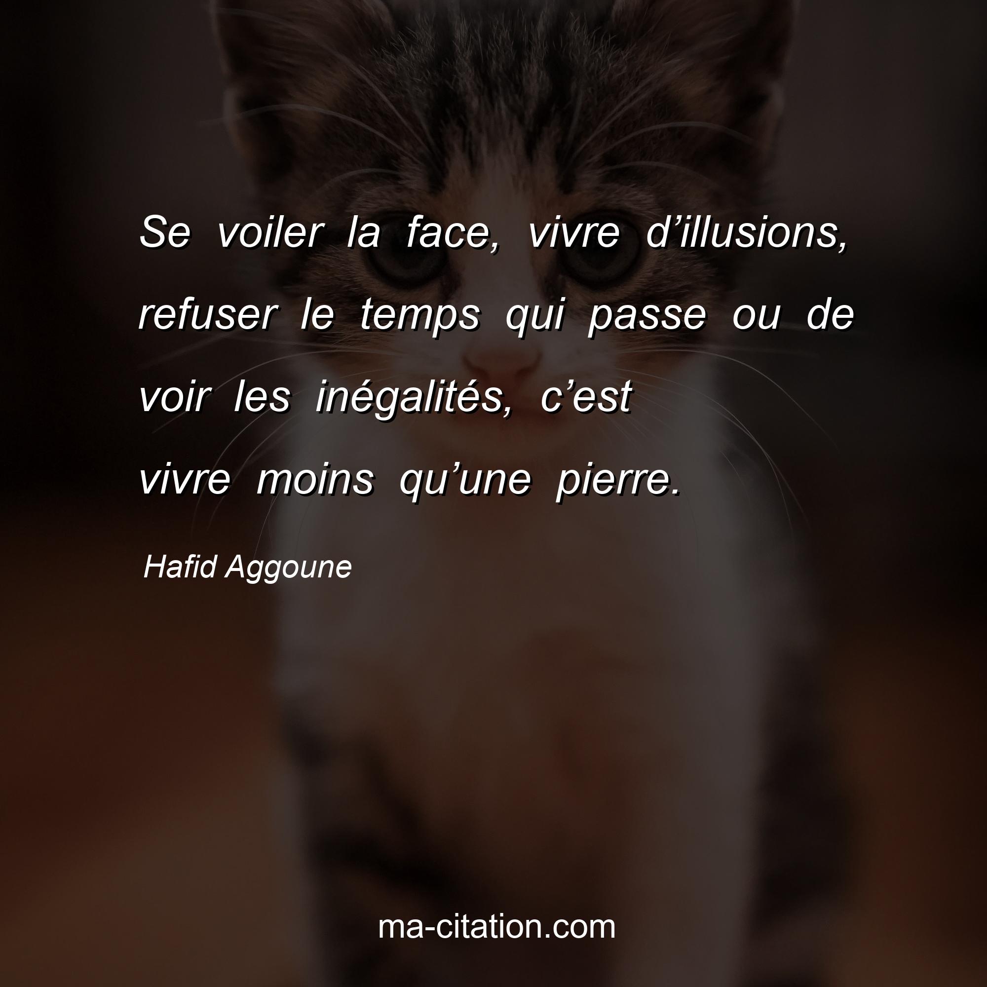 Hafid Aggoune est l'auteur de la citation sur la vie "Se voiler la face, vivre d’illusions, refuser le temps qui passe ou de voir les inégalités, c’est vivre moins qu’une pierre.".
