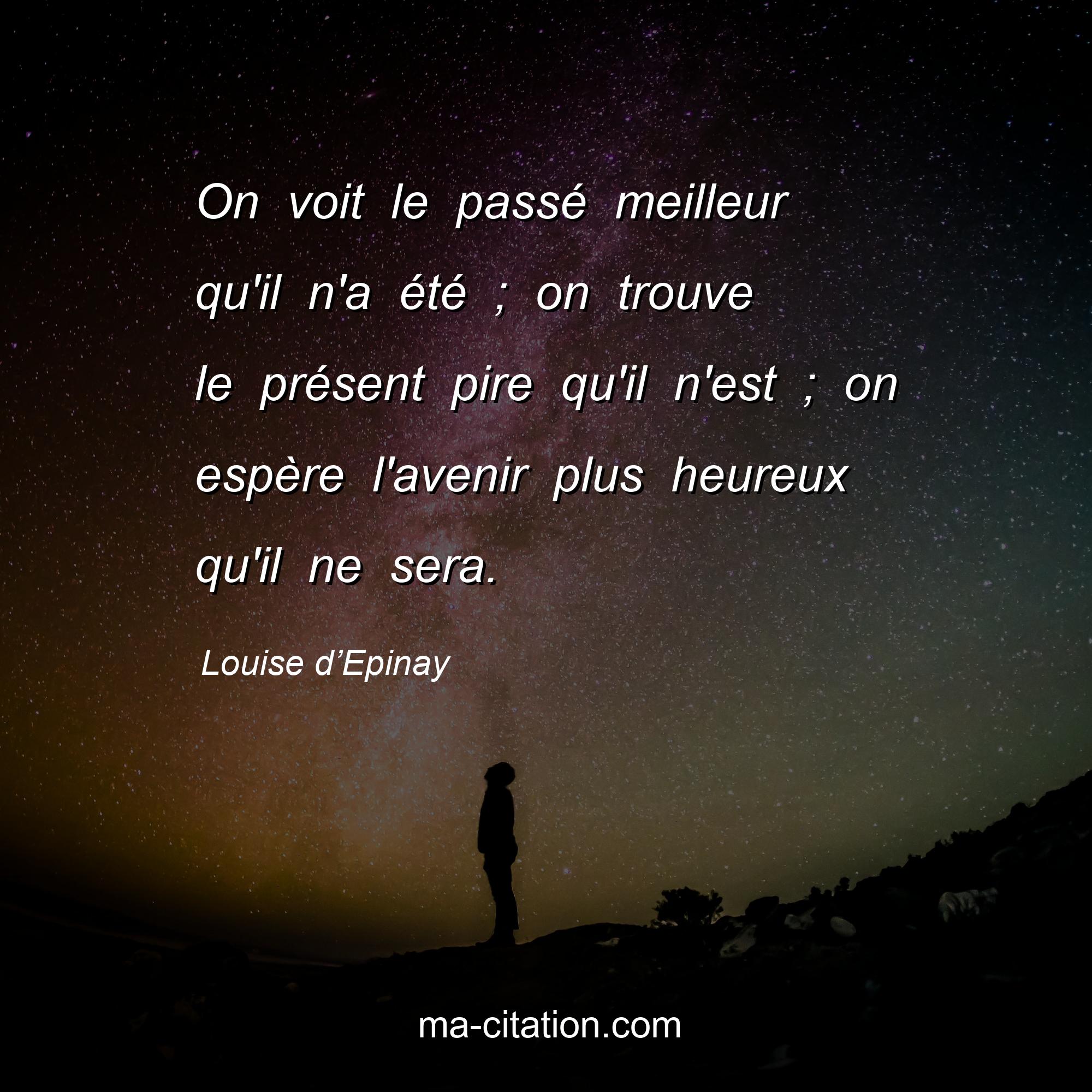 Citation sur la vie de Louise d’Epinay :On voit le passé meilleur qu'il n'a été ; on trouve le présent pire qu'il n'est ; on espère l'avenir plus heureux qu'il ne sera.