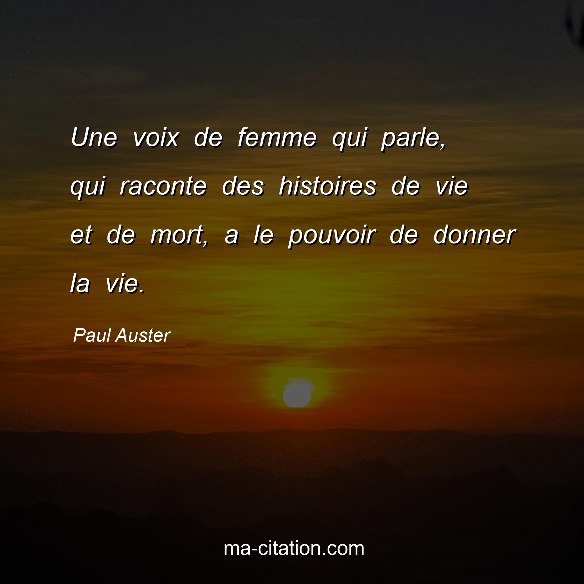 Paul Auster est l'auteur de la citation sur la vie "Une voix de femme qui parle, qui raconte des histoires de vie et de mort, a le pouvoir de donner la vie.".