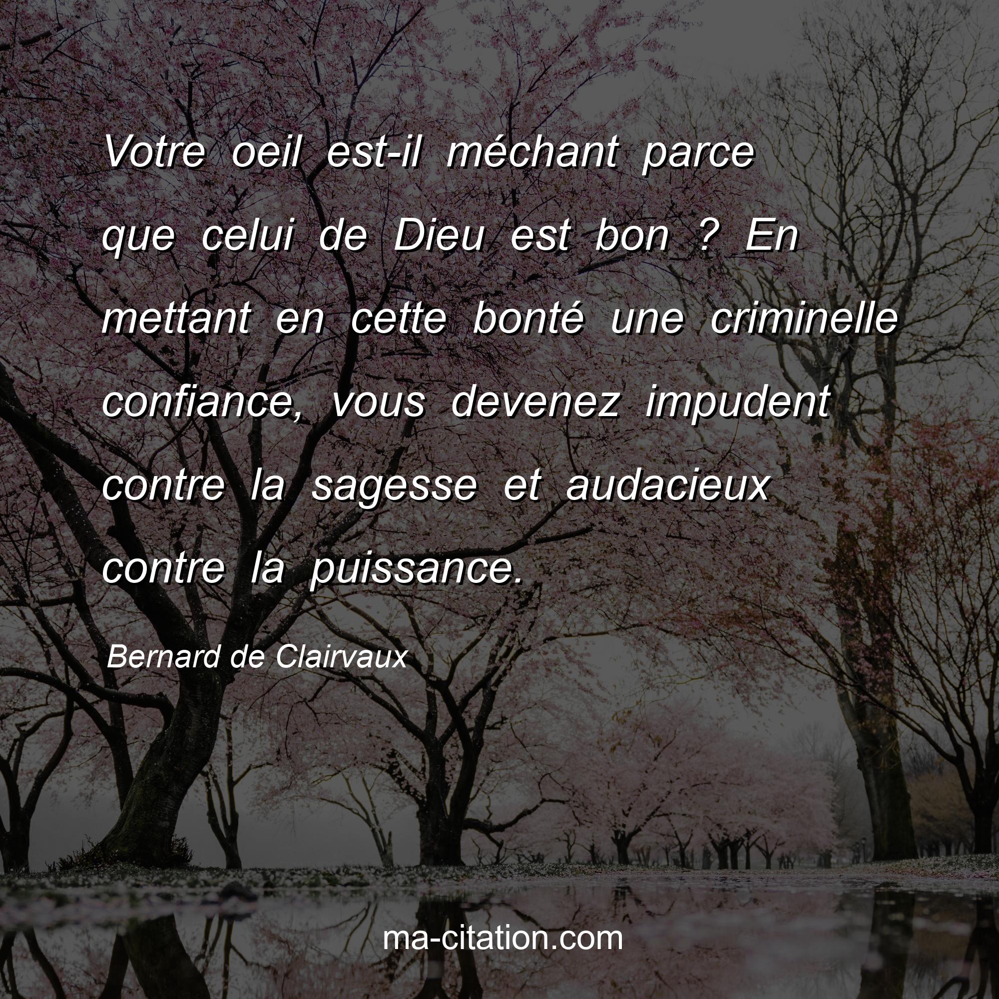 Citation sur la vie de Bernard de Clairvaux :Votre oeil est-il méchant parce que celui de Dieu est bon ? En mettant en cette bonté une criminelle confiance, vous devenez impudent contre la sagesse et audacieux contre la puissance.