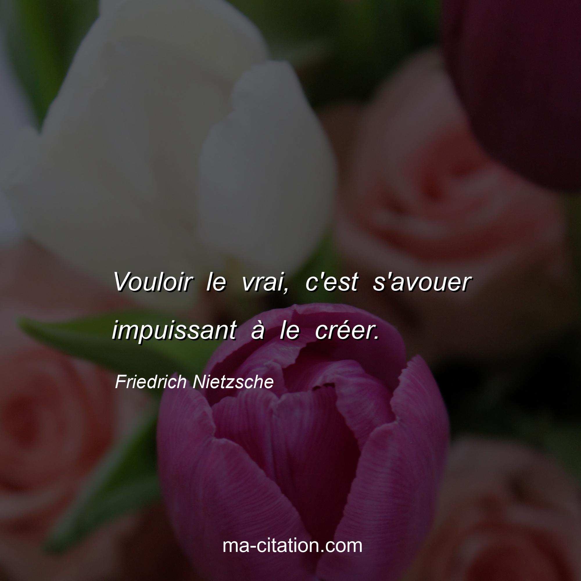 Citation sur la vie de Friedrich Nietzsche :Vouloir le vrai, c'est s'avouer impuissant à le créer.