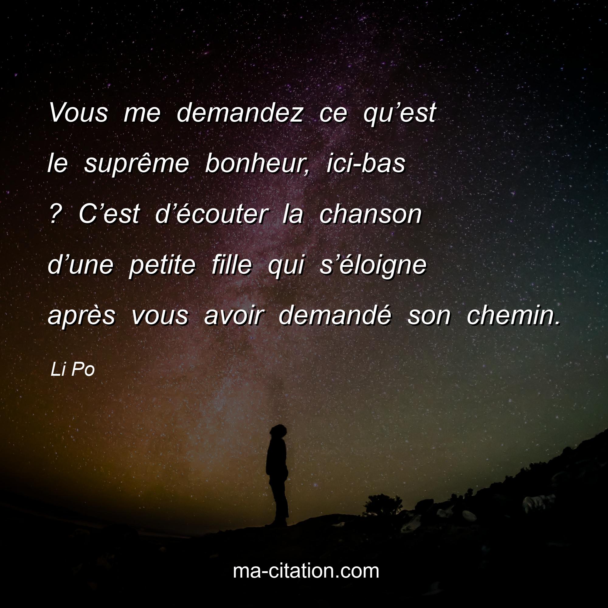 Citation sur la vie de Li Po :Vous me demandez ce qu’est le suprême bonheur, ici-bas ? C’est d’écouter la chanson d’une petite fille qui s’éloigne après vous avoir demandé son chemin.