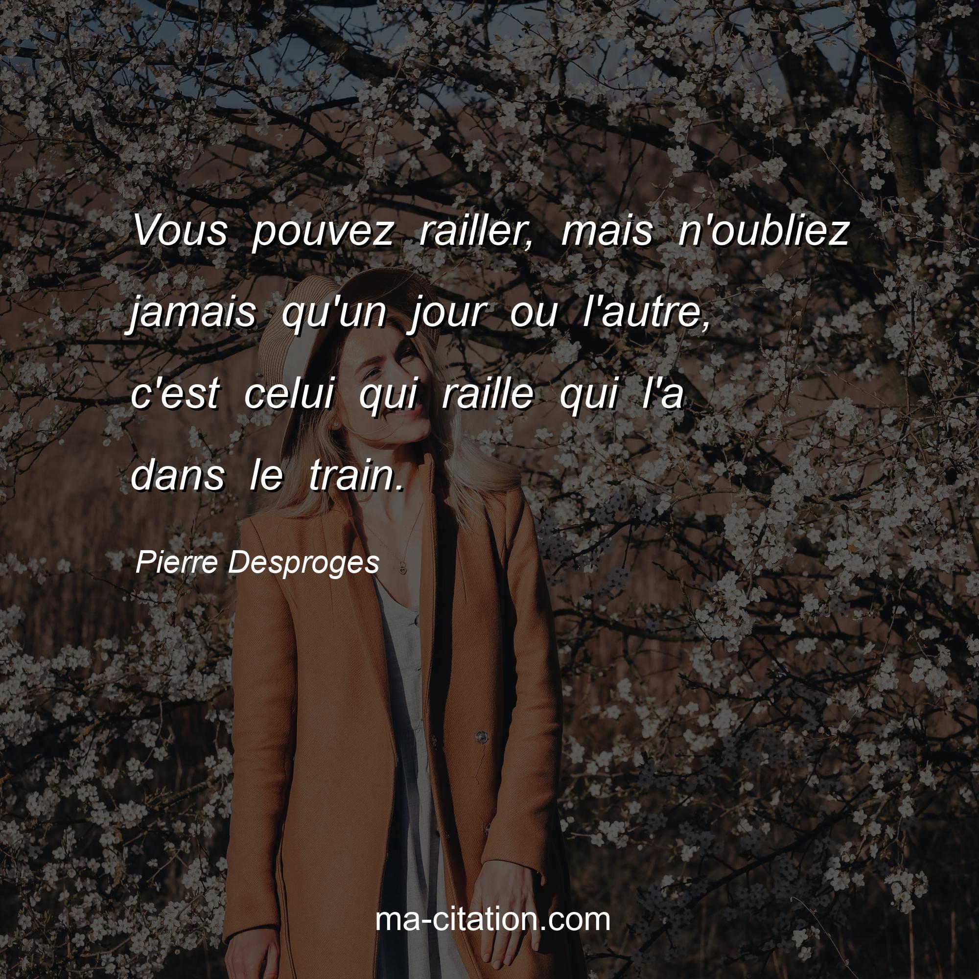 Pierre Desproges est l'auteur de la citation sur la vie "Vous pouvez railler, mais n'oubliez jamais qu'un jour ou l'autre, c'est celui qui raille qui l'a dans le train.".