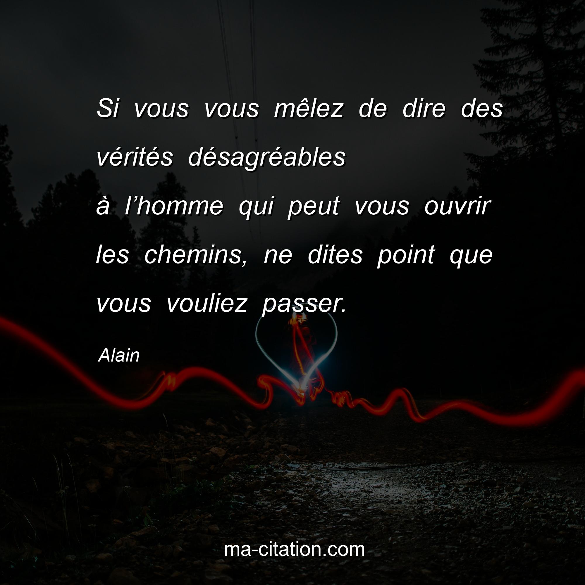 Citation sur la vie d'Alain :Si vous vous mêlez de dire des vérités désagréables à l’homme qui peut vous ouvrir les chemins, ne dites point que vous vouliez passer.