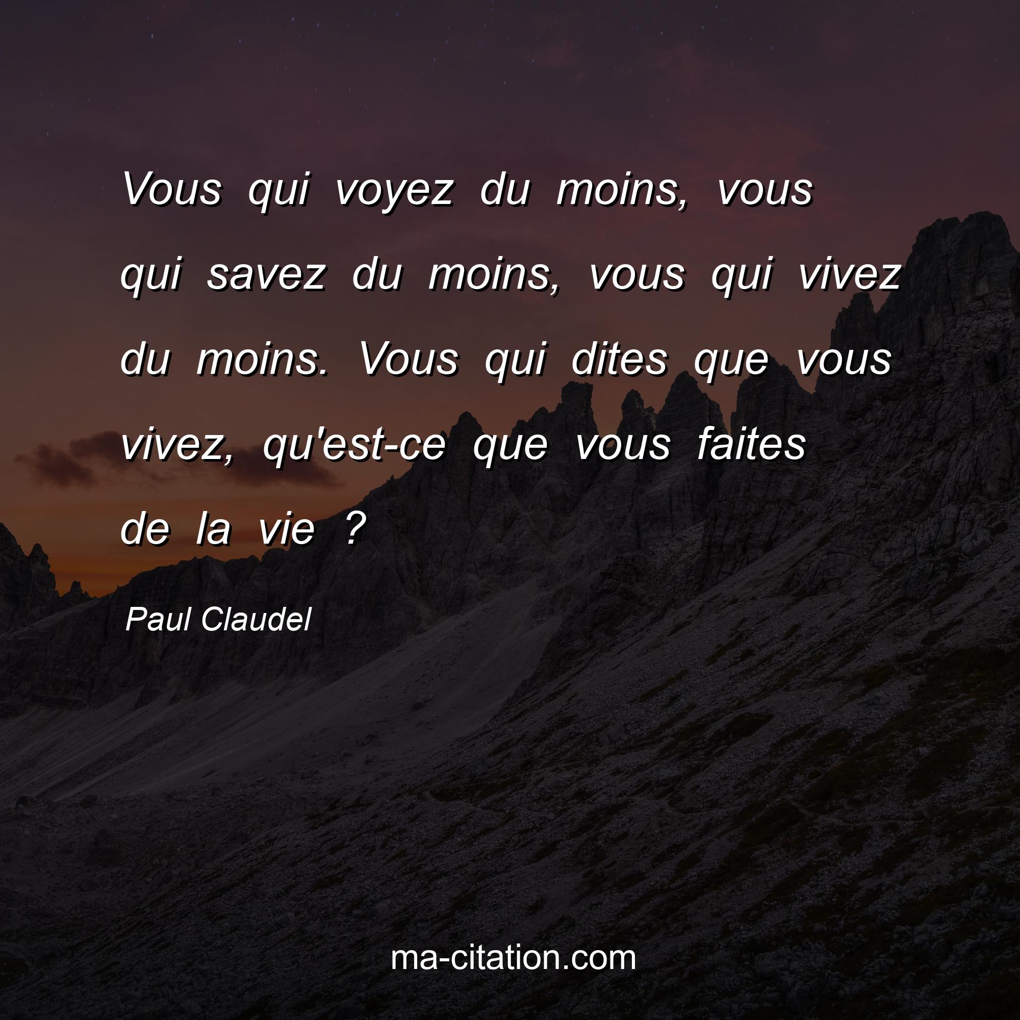 Citation sur la vie de Paul Claudel :Vous qui voyez du moins, vous qui savez du moins, vous qui vivez du moins. Vous qui dites que vous vivez, qu'est-ce que vous faites de la vie ?
