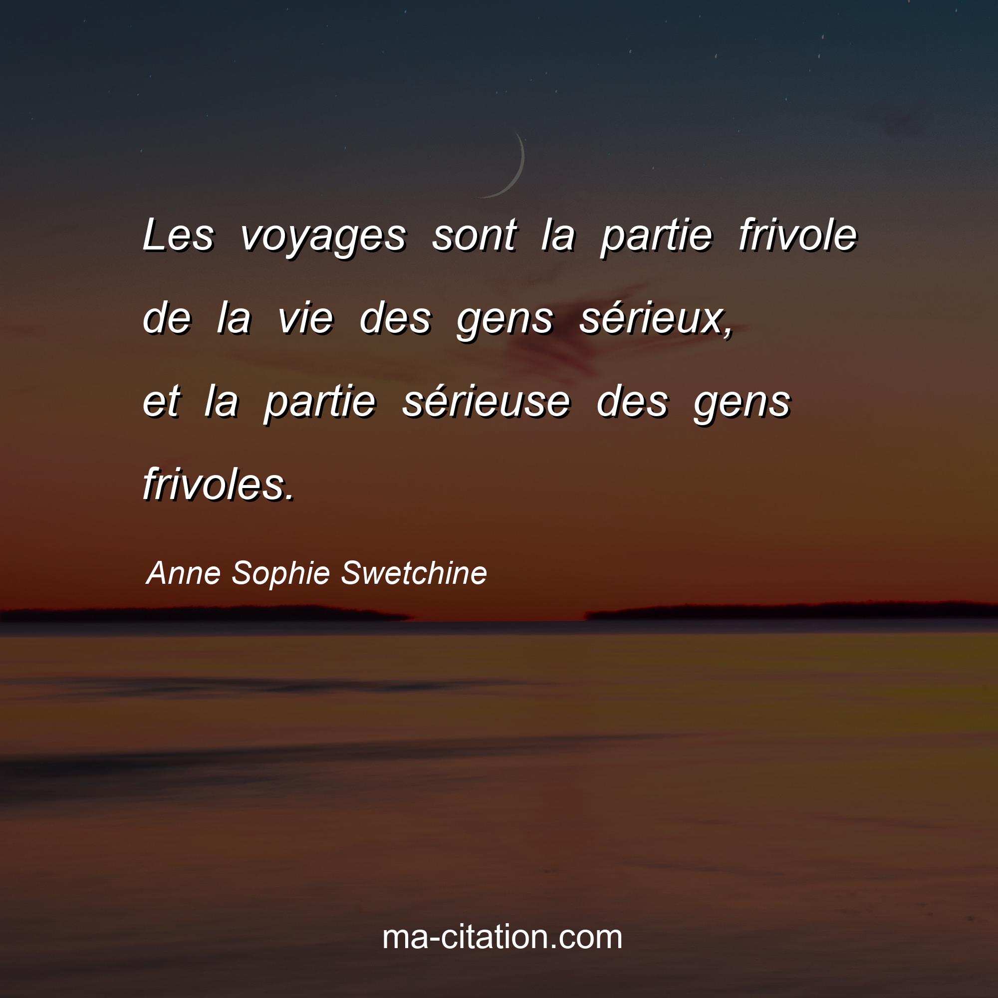 Citation sur la vie d'Anne Sophie Swetchine :Les voyages sont la partie frivole de la vie des gens sérieux, et la partie sérieuse des gens frivoles.