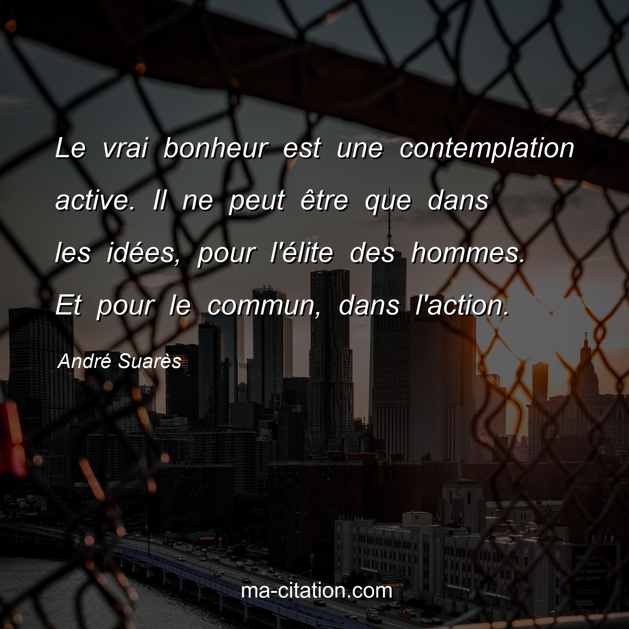 Citation sur la vie d'André Suarès :Le vrai bonheur est une contemplation active. Il ne peut être que dans les idées, pour l'élite des hommes. Et pour le commun, dans l'action.