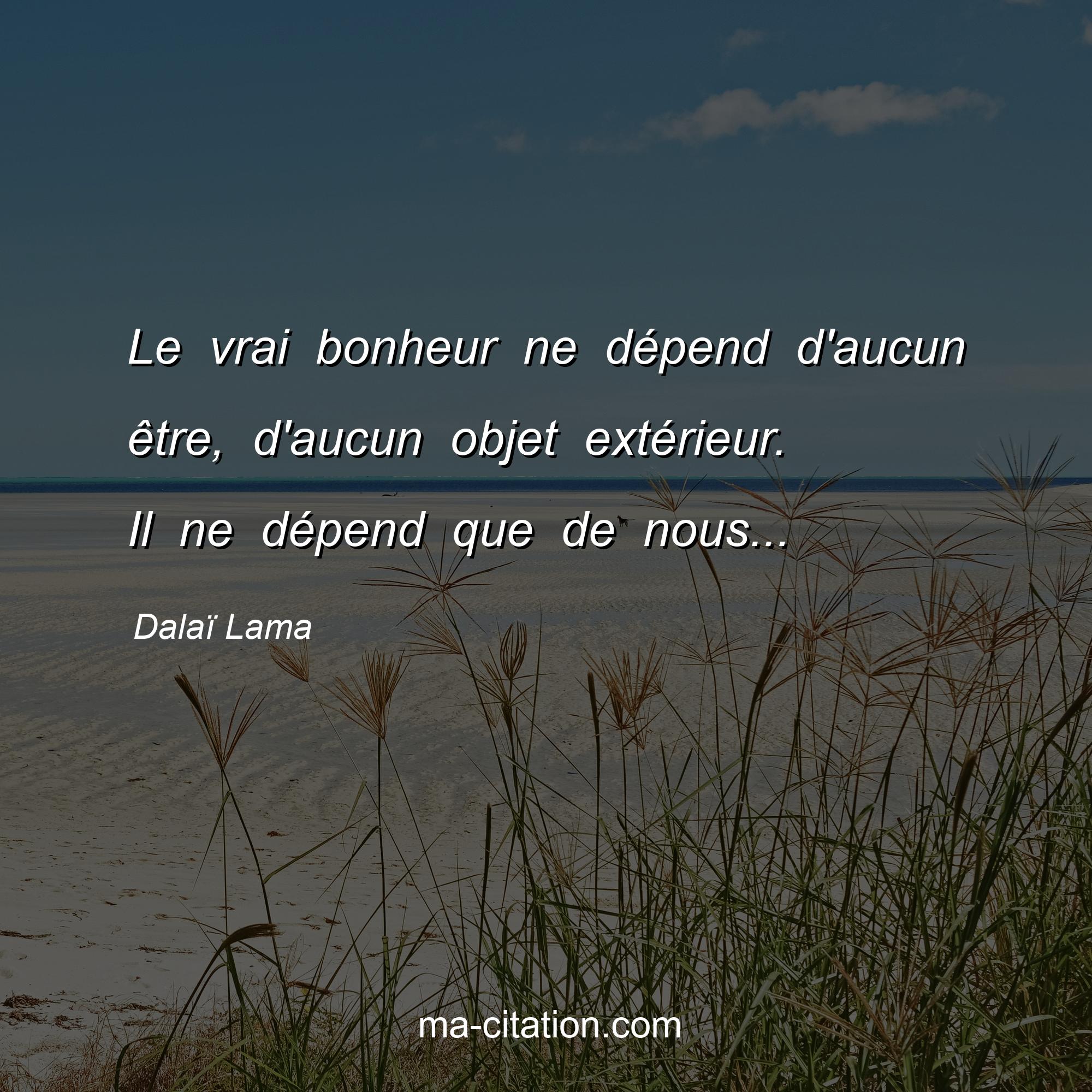 Dalaï Lama est l'auteur de la citation sur la vie "Le vrai bonheur ne dépend d'aucun être, d'aucun objet extérieur. Il ne dépend que de nous...".