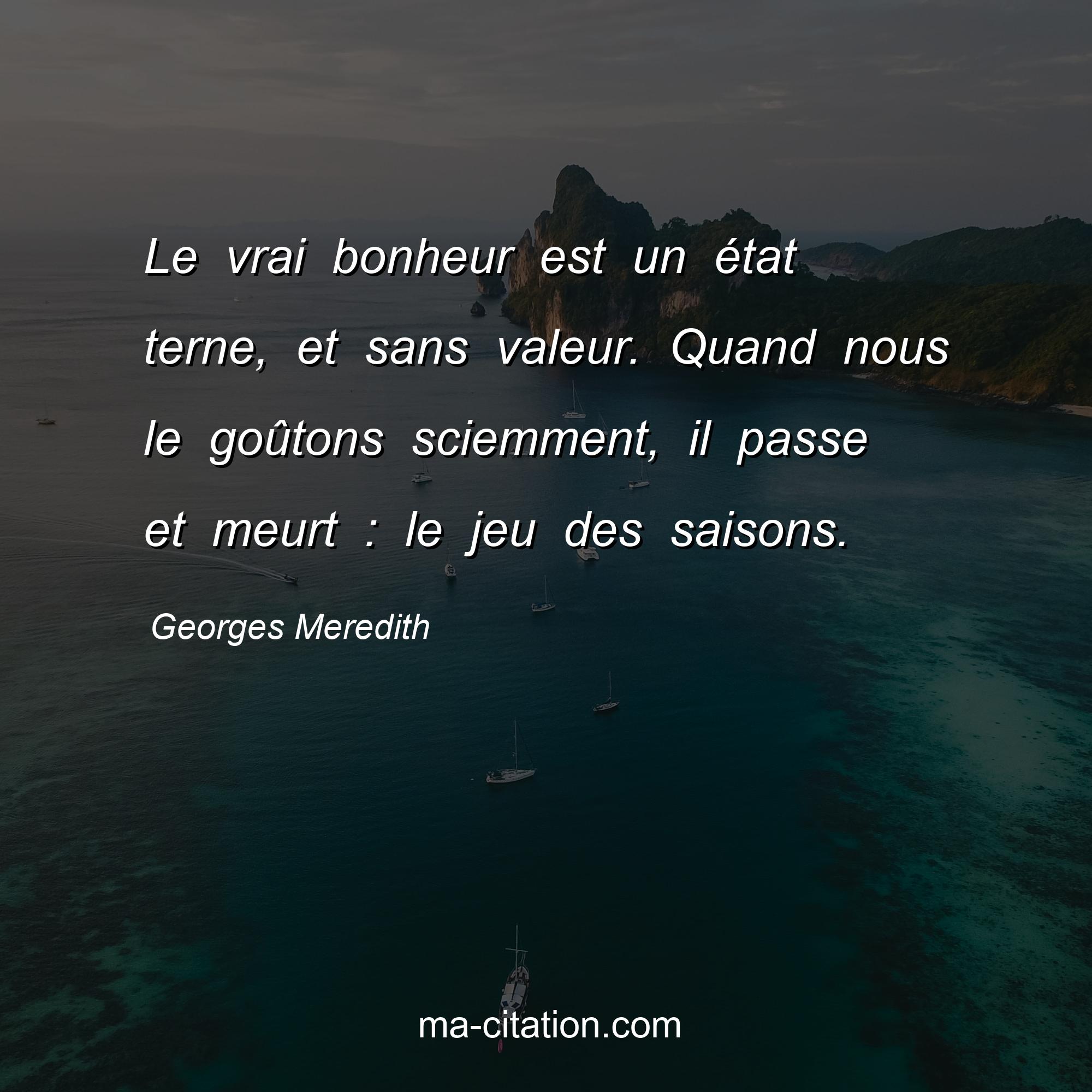 Citation sur la vie de Georges Meredith :Le vrai bonheur est un état terne, et sans valeur. Quand nous le goûtons sciemment, il passe et meurt : le jeu des saisons.