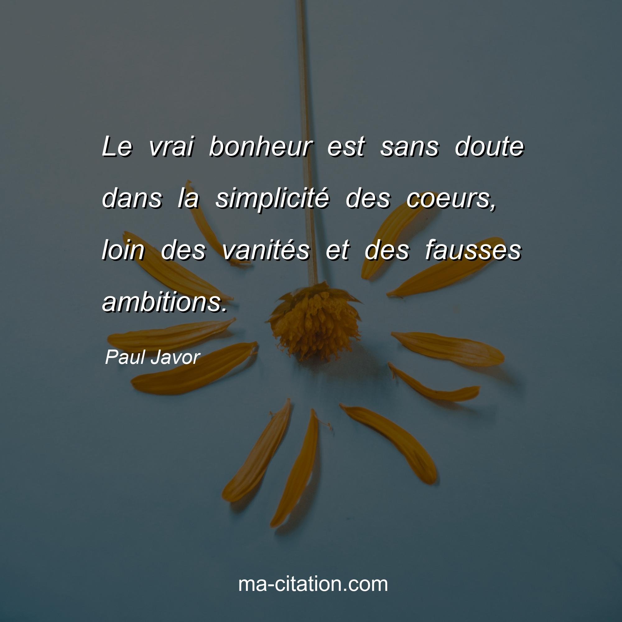 Paul Javor est l'auteur de la citation sur la vie "Le vrai bonheur est sans doute dans la simplicité des coeurs, loin des vanités et des fausses ambitions.".