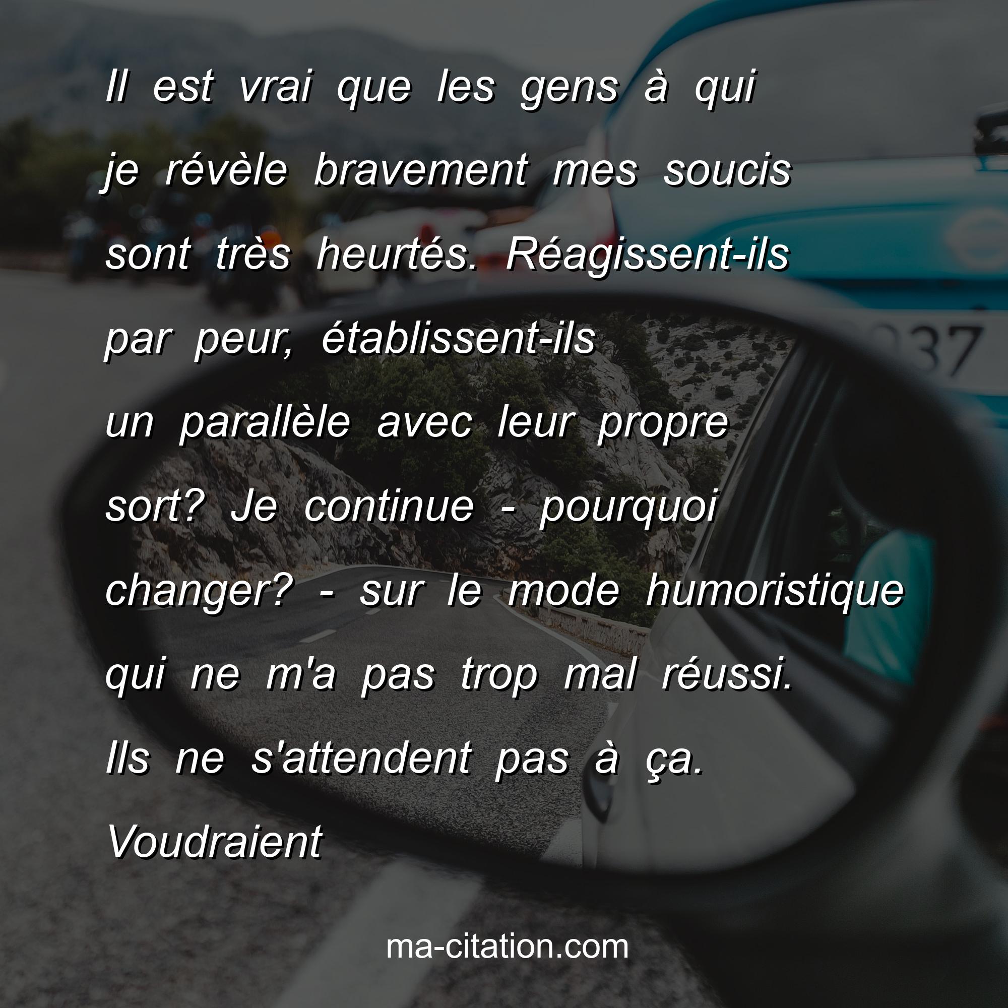 Il est vrai que les gens à qui je révèle bravement mes soucis sont très heurtés. Réagissent-ils par peur, établissent-ils un parallèle avec leur propre sort? Je continue - pourquoi changer? - sur le mode humoristique qui ne m'a pas trop mal réussi. Ils ne s'attendent pas à ça. Voudraient