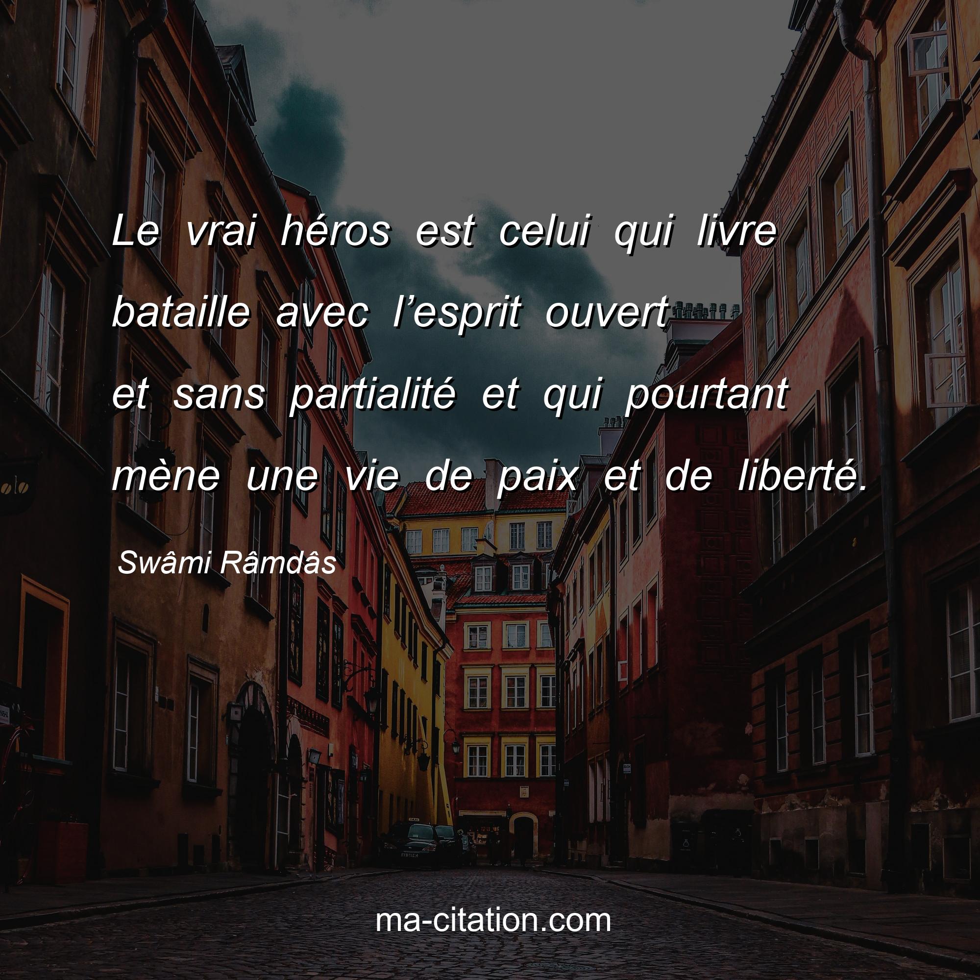 Swâmi Râmdâs est l'auteur de la citation sur la vie "Le vrai héros est celui qui livre bataille avec l’esprit ouvert et sans partialité et qui pourtant mène une vie de paix et de liberté.".