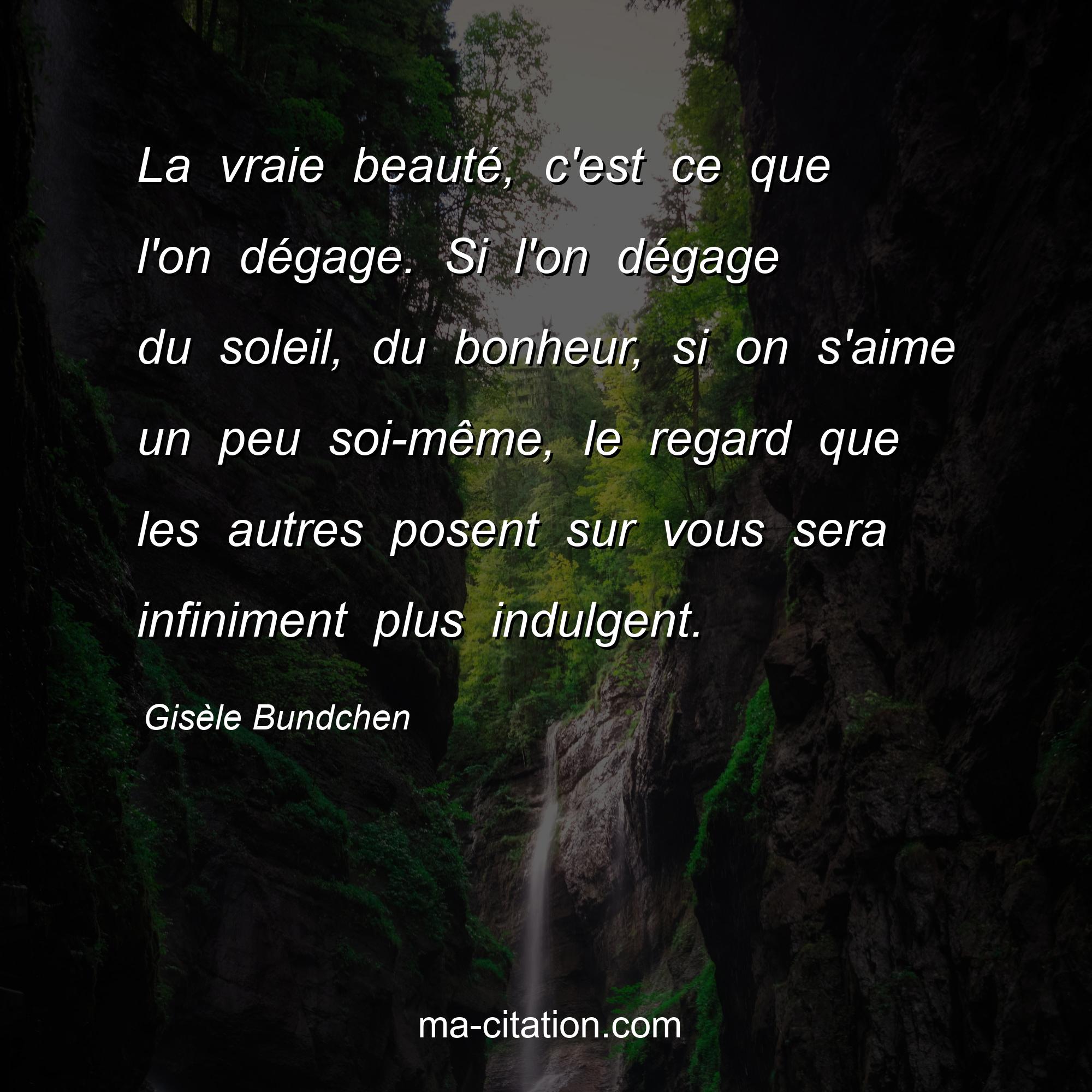 Citation sur la vie de Gisèle Bundchen :La vraie beauté, c'est ce que l'on dégage. Si l'on dégage du soleil, du bonheur, si on s'aime un peu soi-même, le regard que les autres posent sur vous sera infiniment plus indulgent.