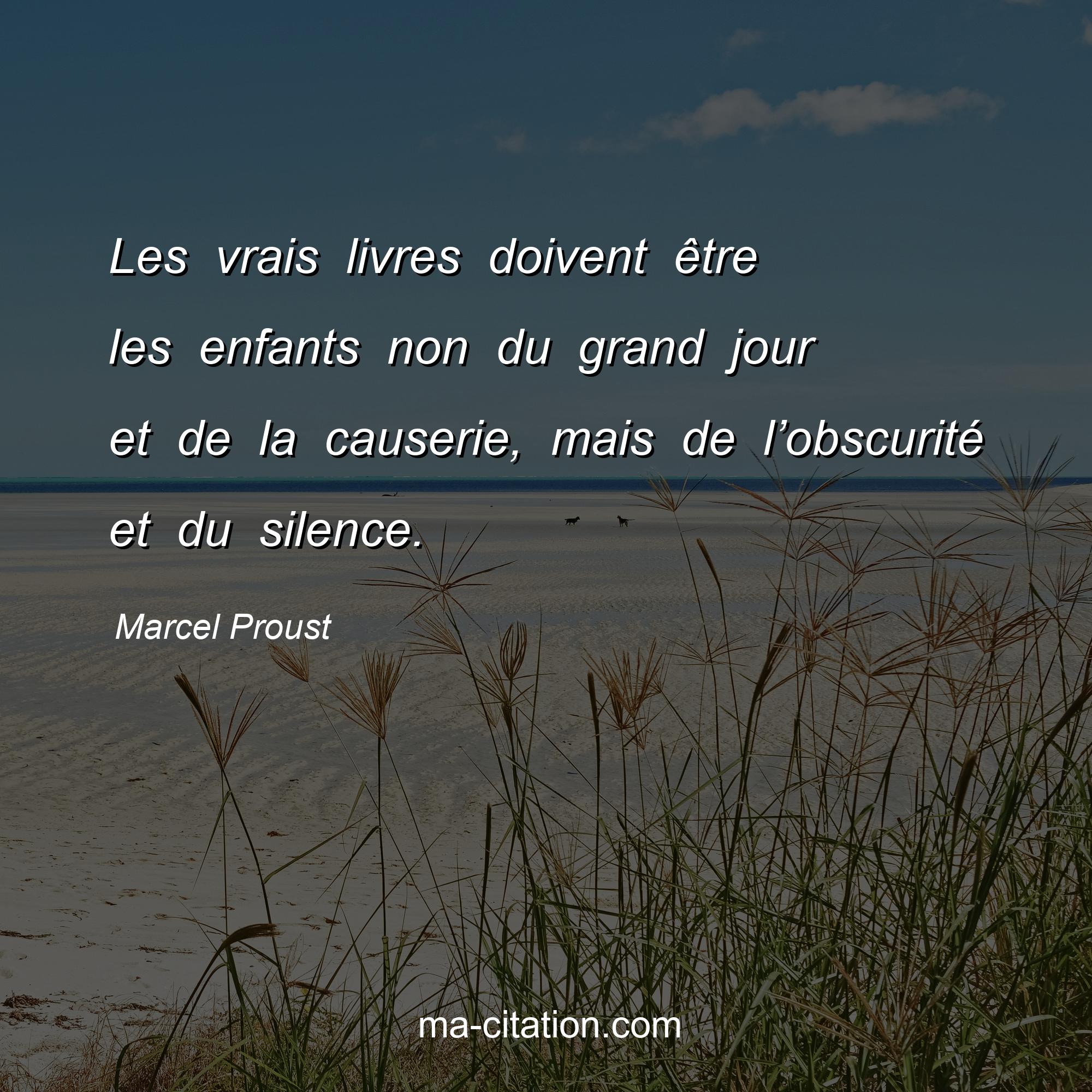 Citation sur la vie de Marcel Proust :Les vrais livres doivent être les enfants non du grand jour et de la causerie, mais de l’obscurité et du silence.