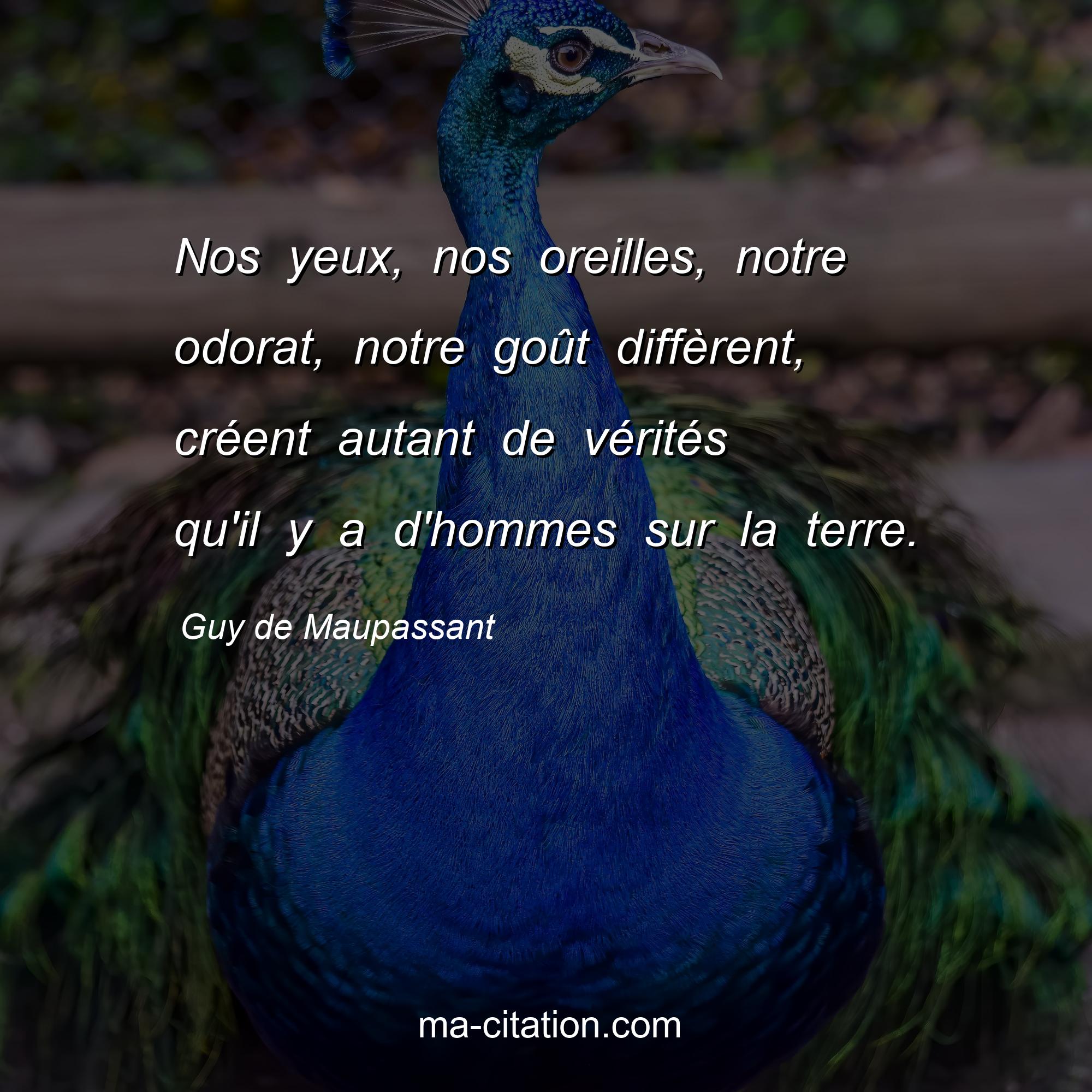 Citation sur la vie de Guy de Maupassant :Nos yeux, nos oreilles, notre odorat, notre goût diffèrent, créent autant de vérités qu'il y a d'hommes sur la terre.