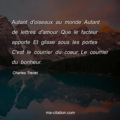Autant d'oiseaux au monde Autant de lettres d'amour Que le facteur apporte Et glisse sous les portes C'est le courrier du coeur Le courrier du bonheur.