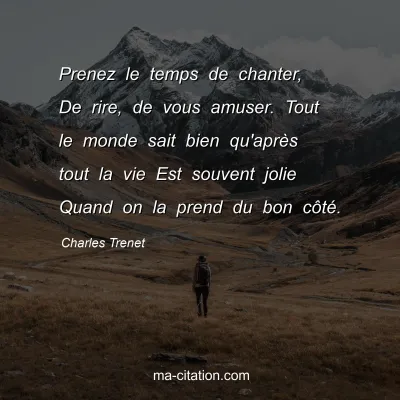 Prenez le temps de chanter, De rire, de vous amuser. Tout le monde sait bien qu'après tout la vie Est souvent jolie Quand on la prend du bon côté.