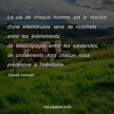 La vie de chaque homme est le résultat d'une interminable série de ricochets entre les événements, de télescopages entre les existences, de croisements dont chacun nous prédestine à l'inévitable.