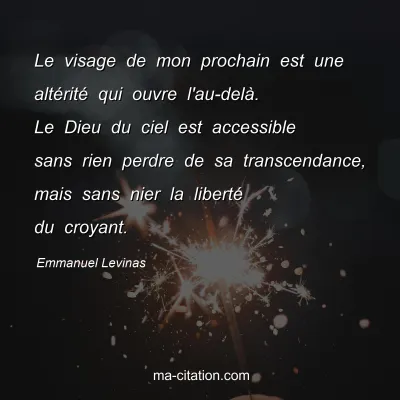 Le visage de mon prochain est une altérité qui ouvre l'au-delà . Le Dieu du ciel est accessible sans rien perdre de sa transcendance, mais sans nier la liberté du croyant.