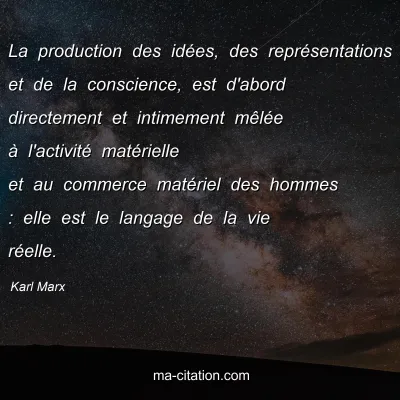 La production des idées, des représentations et de la conscience, est d'abord directement et intimement mêlée à l'activité matérielle et au commerce matériel des hommes : elle est le langage de la vie réelle.