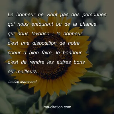 Le bonheur ne vient pas des personnes qui nous entourent ou de la chance qui nous favorise ; le bonheur c'est une disposition de notre coeur à bien faire, le bonheur c'est de rendre les autres bons ou meilleurs.