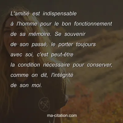 L'amitié est indispensable à l'homme pour le bon fonctionnement de sa mémoire. Se souvenir de son passé, le porter toujours avec soi, c'est peut-être la condition nécessaire pour conserver, comme on dit, l'intégrité de son moi.