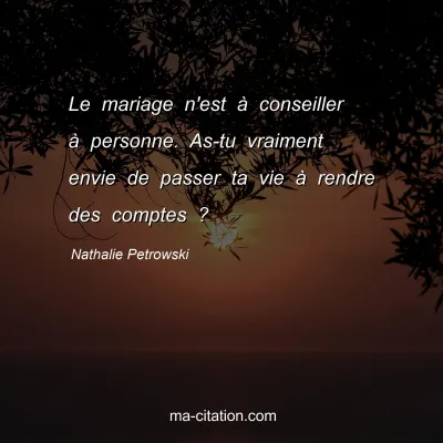 Le mariage n'est à conseiller à personne. As-tu vraiment envie de passer ta vie à rendre des comptes ?