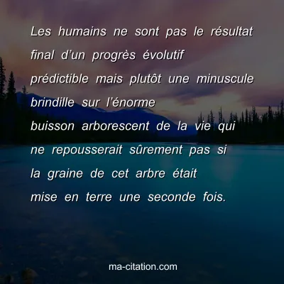 Les humains ne sont pas le résultat final d’un progrès évolutif prédictible mais plutôt une minuscule brindille sur l’énorme buisson arborescent de la vie qui ne repousserait sûrement pas si la graine de cet arbre était mise en terre une seconde fois.
