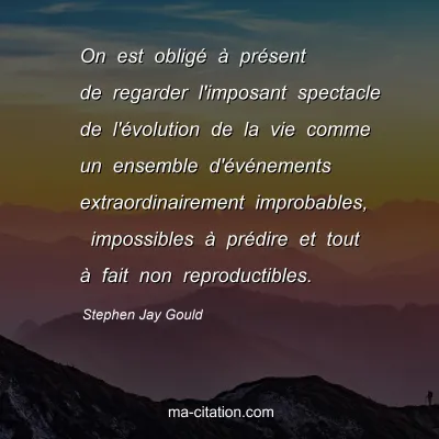 On est obligé à présent de regarder l'imposant spectacle de l'évolution de la vie comme un ensemble d'événements extraordinairement improbables, impossibles à prédire et tout à fait non reproductibles.